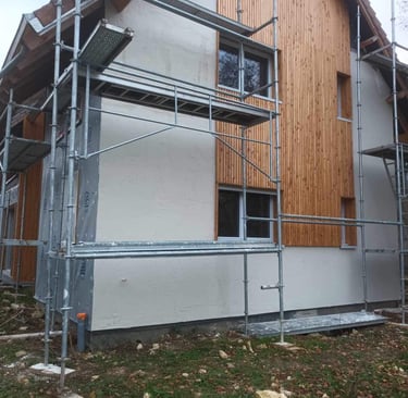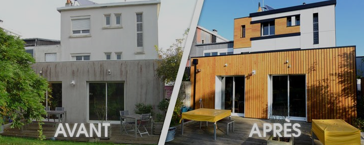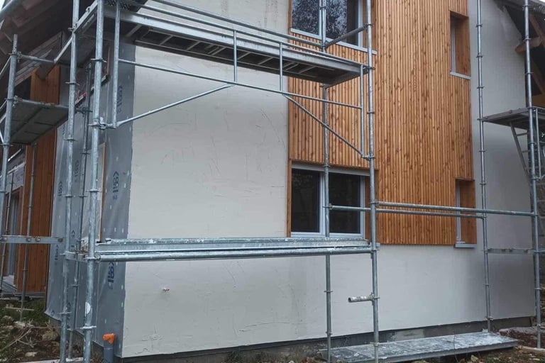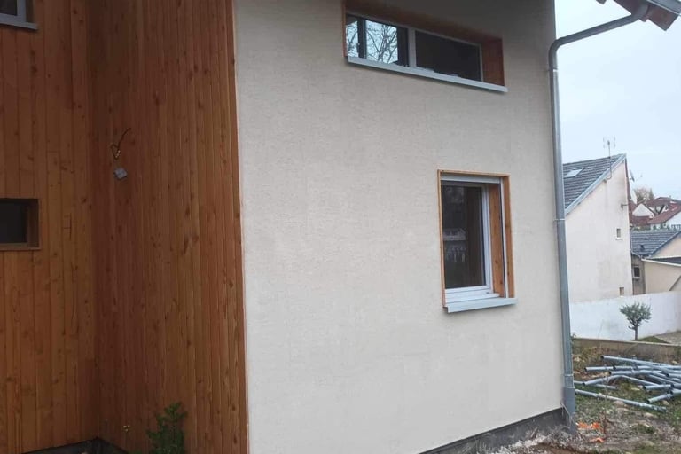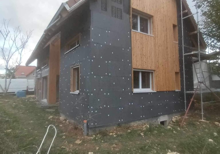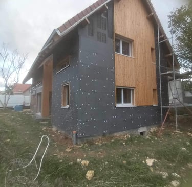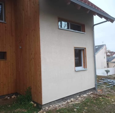 Transformation et embellissement de façade: Ce projet met en lumière une transformation complète de façade, passant d’un aspect classique à une esthétique moderne et chaleureuse grâce à la pose d’un bardage bois