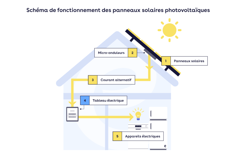 Enfin, ce courant alternatif est prêt pour rejoindre votre maison et couvrir vos besoins en électricité, voire plus : éclairages, prises, radiateurs, appareils électroménagers, équipements informatiques, etc.